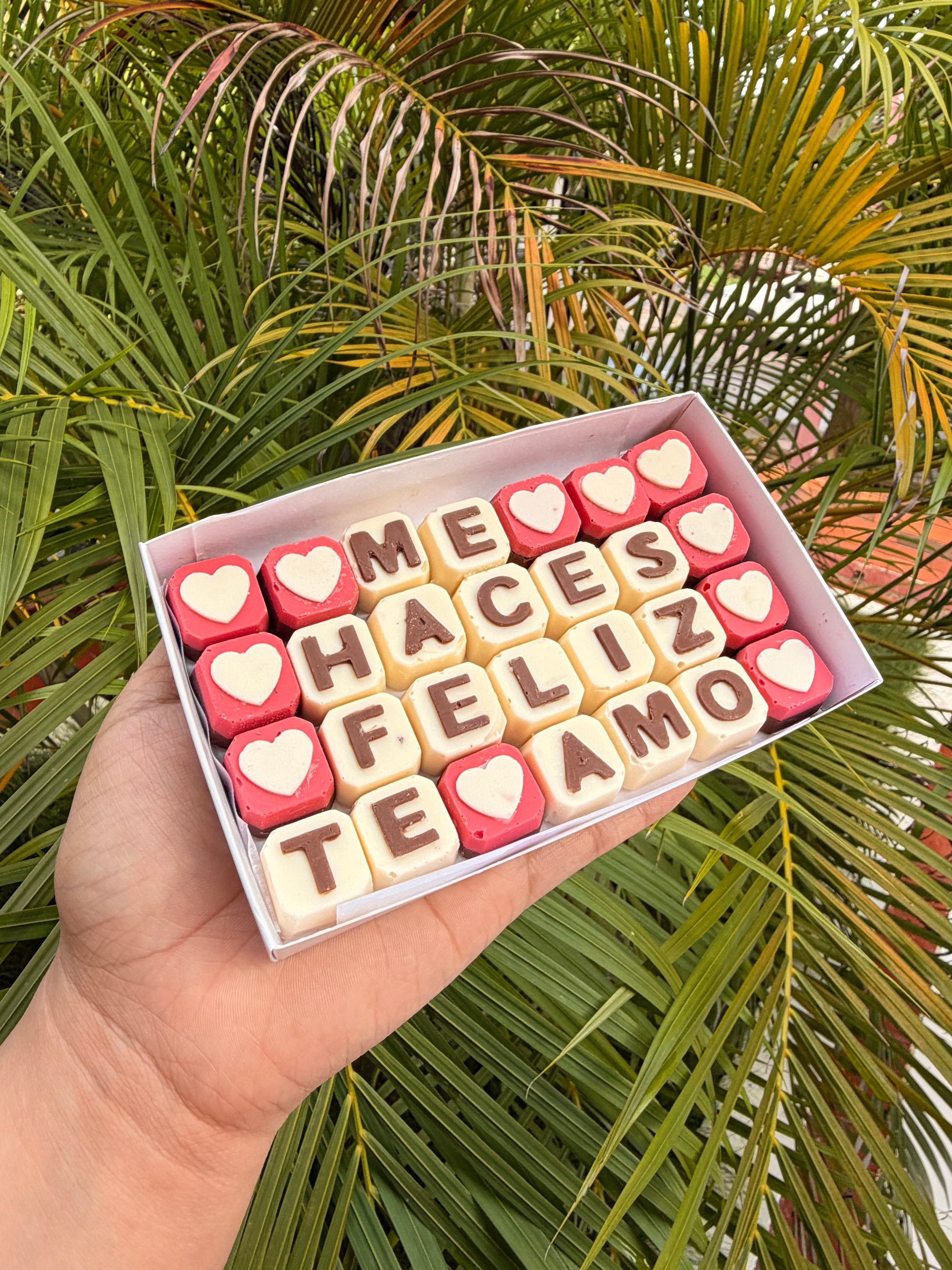 28 cubos de chocolate con mensaje Me haces feliz te amo